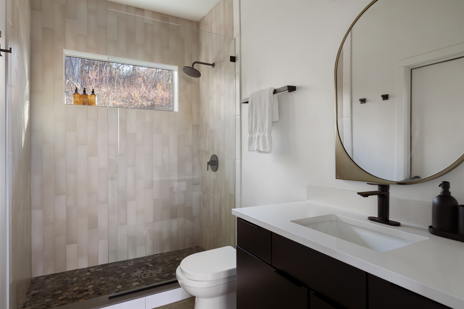 Downstairs features 2 full bathrooms total — including a beautifully designed shared bath with double sinks, ample counter space, and perfect lighting for groups getting ready together (hello, bachelorettes ✨).